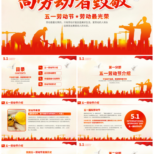 这是一张五一劳动节节日PPT模板,包含五一劳动节、节日等主题内容,也可用作五一劳动节、劳动节节日、五一节日等PPT场景使用。