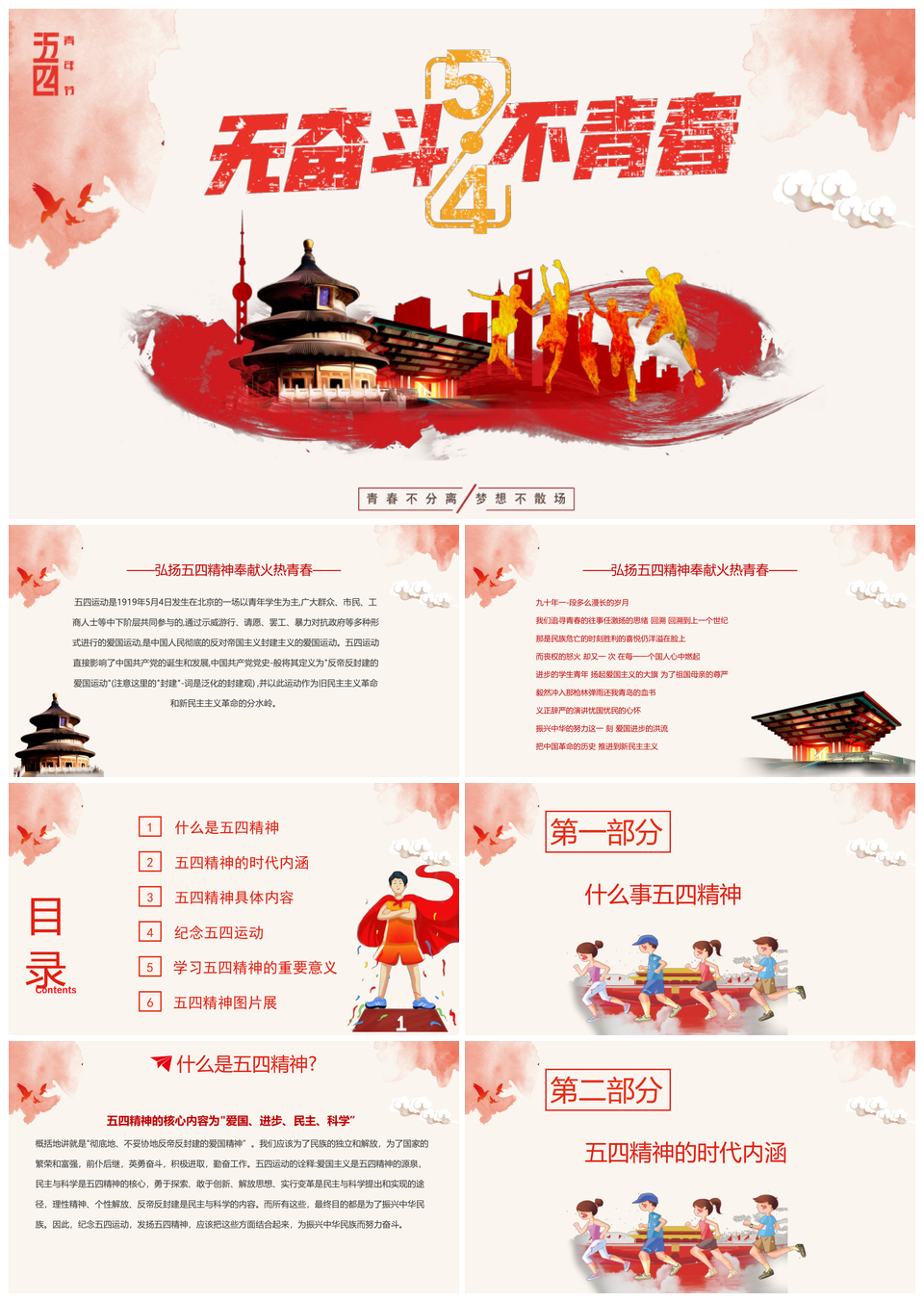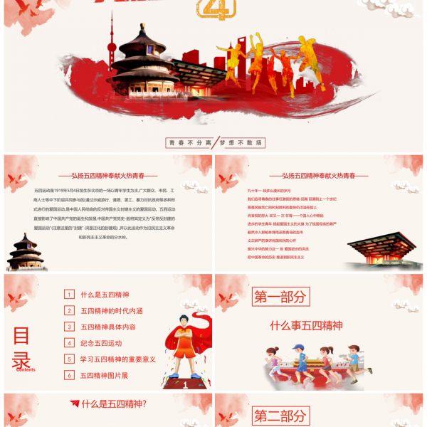 这是一张红色纪念五四运动弘扬五四精神PPT模板,包含红色、纪念、五四运动、弘扬、五四精神等主题内容,也可用作纪念五四运动弘扬五四精神、红色纪念五四运动、纪念五四运动弘扬、五四运动弘扬五四精神、红色纪念、纪念五四运动、五四运动弘扬、弘扬五四精神等PPT场景使用。