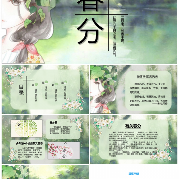 本站提供的节气春分手绘风绿色PPT模板,下载格式为pptx,一共6页,作品中文字及图均可以修改和编辑,图片更改请在作品中右键图片并更换,文字修改请直接点击文字进行修改。