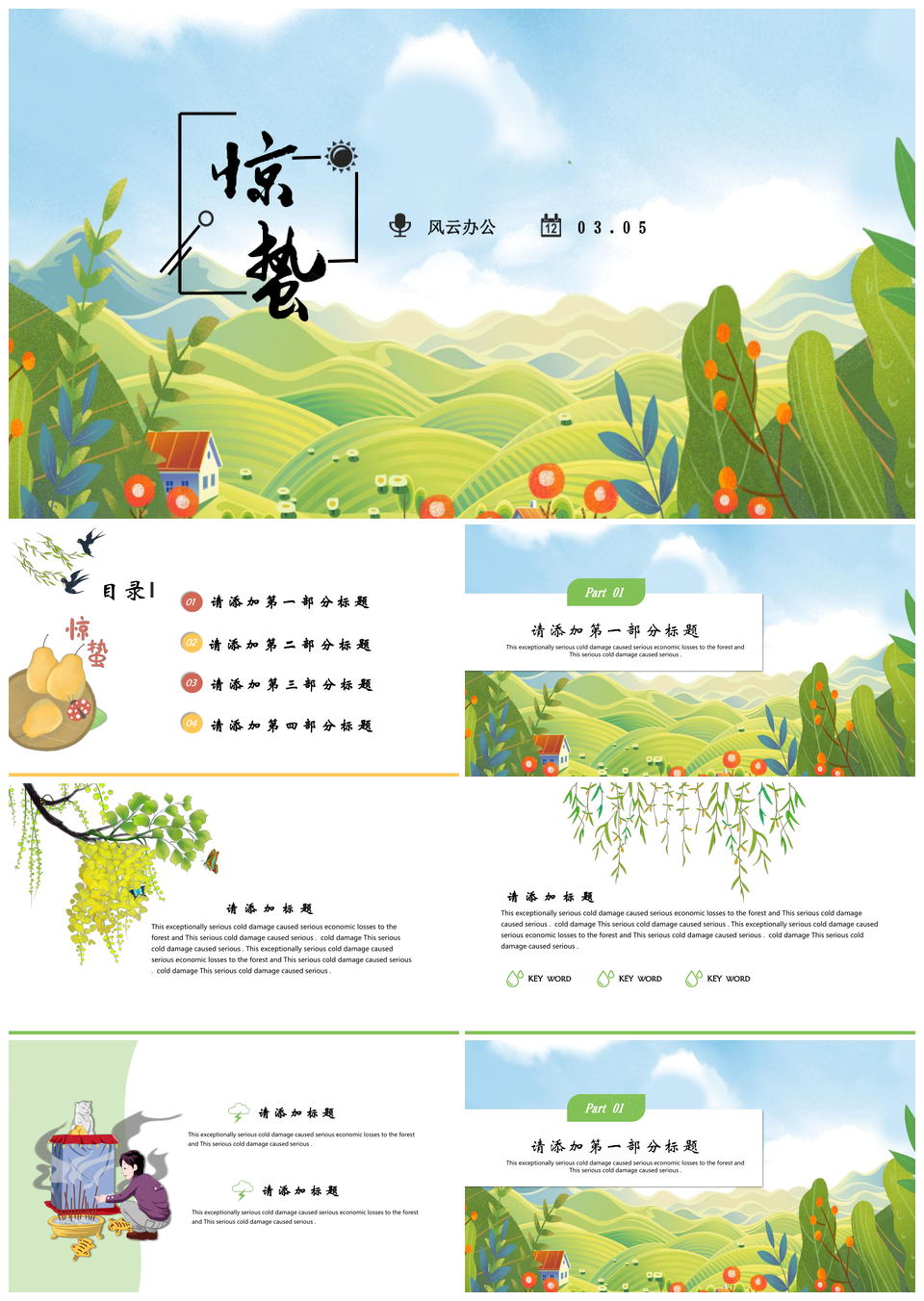 本站提供的白色惊蛰节气小清新PPT模板,下载格式为pptx,一共19页,作品中文字及图均可以修改和编辑,图片更改请在作品中右键图片并更换,文字修改请直接点击文字进行修改。
