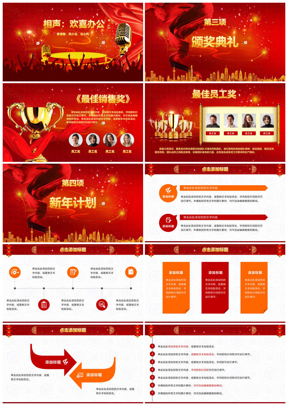 本站提供的2025喜庆开门红年终总结企业年会通用PPT模板,下载格式为pptx,一共29页,作品中文字及图均可以修改和编辑,图片更改请在作品中右键图片并更换,文字修改请直接点击文字进行修改。
