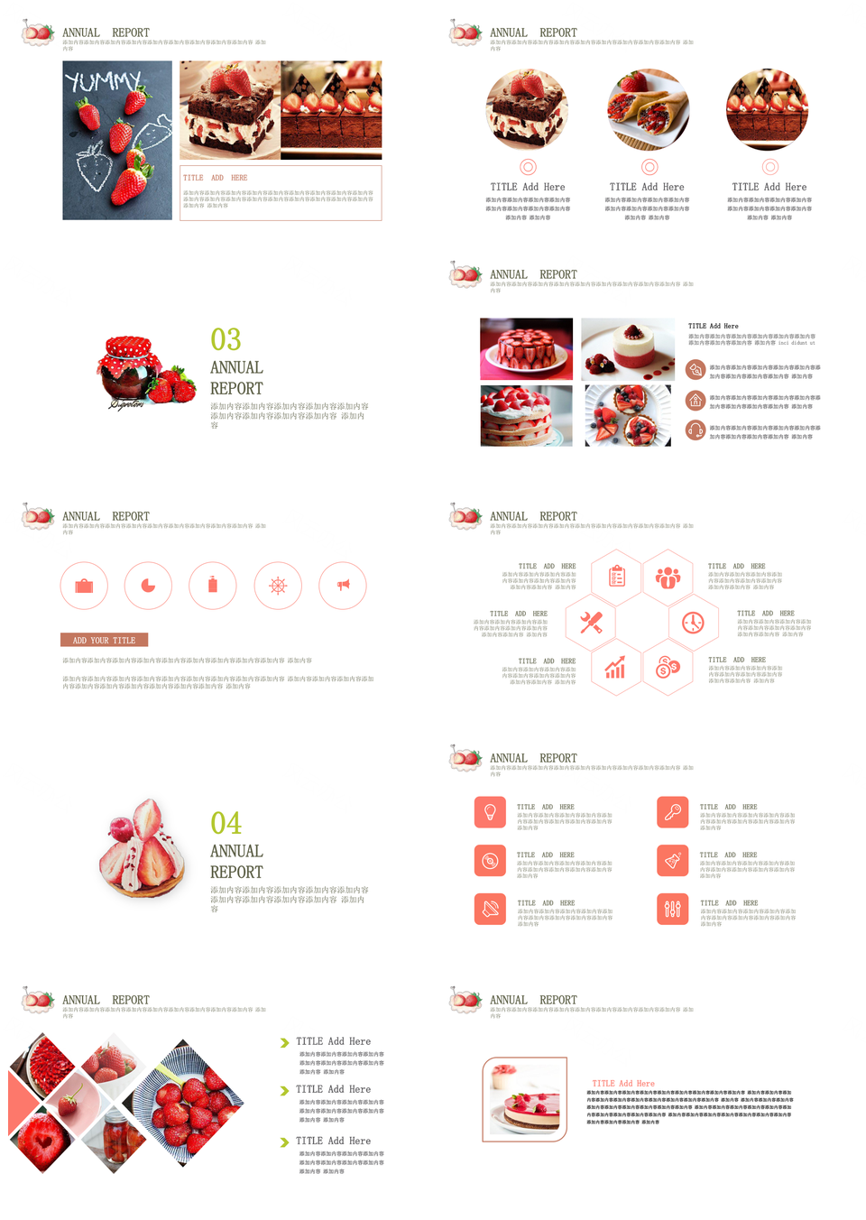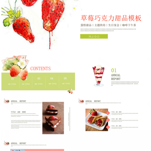 本站提供的绿色插画草莓巧克力咖啡蛋糕甜品烘培PPT模板,下载格式为pptx,一共22页,作品中文字及图均可以修改和编辑,图片更改请在作品中右键图片并更换,文字修改请直接点击文字进行修改。