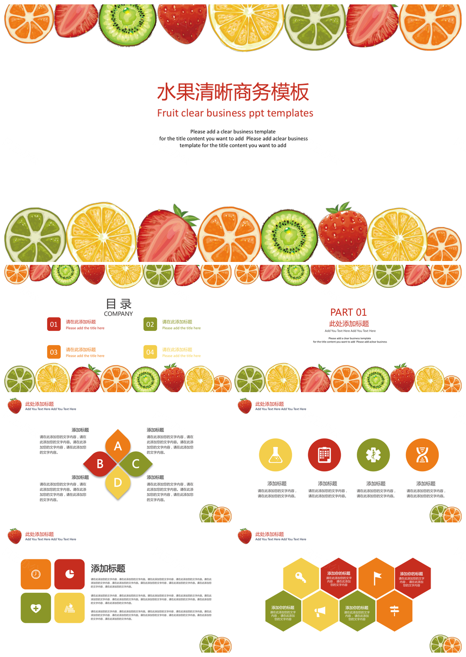 本站提供的彩色炫彩简约水果清晰商务PPT模板,下载格式为pptx,一共20页,作品中文字及图均可以修改和编辑,图片更改请在作品中右键图片并更换,文字修改请直接点击文字进行修改。