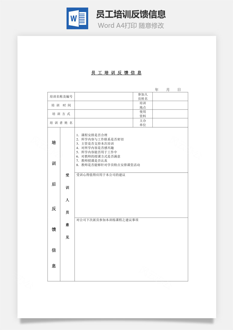 本站提供人事员工培训反馈信息Word模板下载,格式为 word,一共1页,作品中文字及图均可以修改和编辑,图片更改请在作品中右键图片并更换,文字修改请直接点击文字进行修改。更多精彩人力资源Word模板,尽在本站。