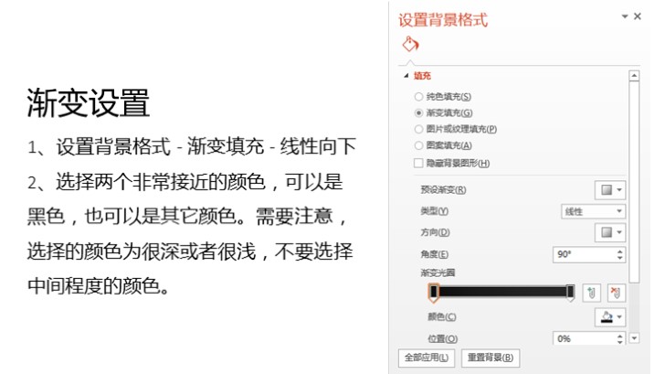 设置背景格式,选择渐变填充;渐变方向选择线性向下,去掉多余的光圈,留下两个;选择两种接近的颜色,案例以黑色和深灰色。也可以选择浅色系,或其他颜色,注意选择颜色较深或较浅的颜色,不要选择中间暗度的颜色,做成的效果会比较难看。