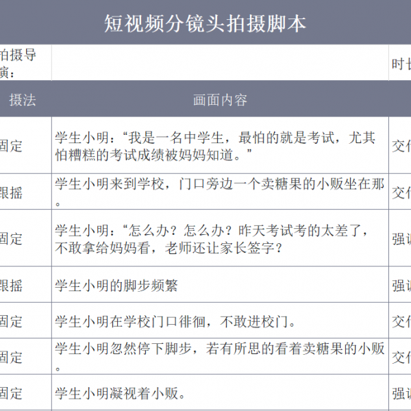 整合拍摄场景、景别、技巧、时长等信息,规范短视频分镜制作流程。