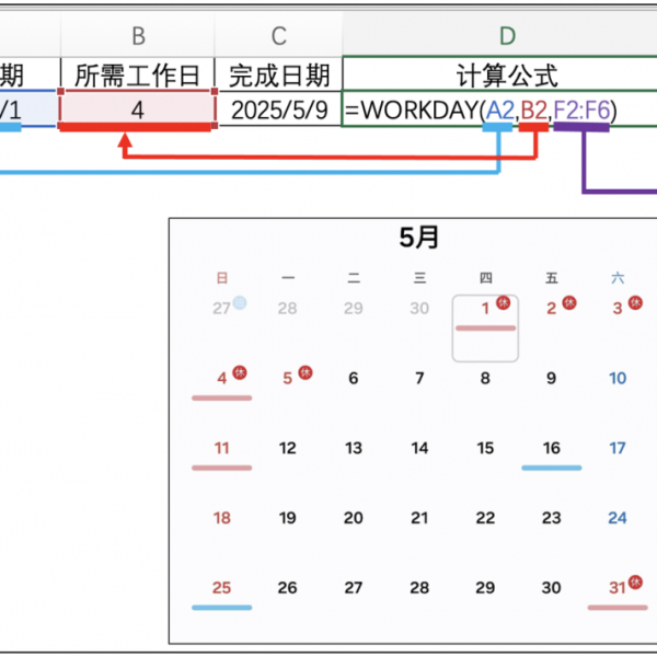 WORKDAY函数的核心功能是:根据“开始日期”“需要的工作日天数”和“节假日”,自动算出任务完成的截止日期。简单来说,就是已知“从哪天开始”“需要工作多少天”,排除周末和节假日后,得出“哪天能完成”。