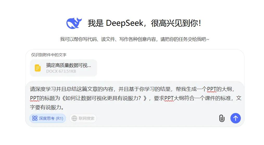 接下来,让我们一起通过实际操作,见证 DeepSeek Kimi 组合的强大威力,看看如何快速制作一份以《如何让数据可视化更具有说服力?》为题的专业课件 PPT。