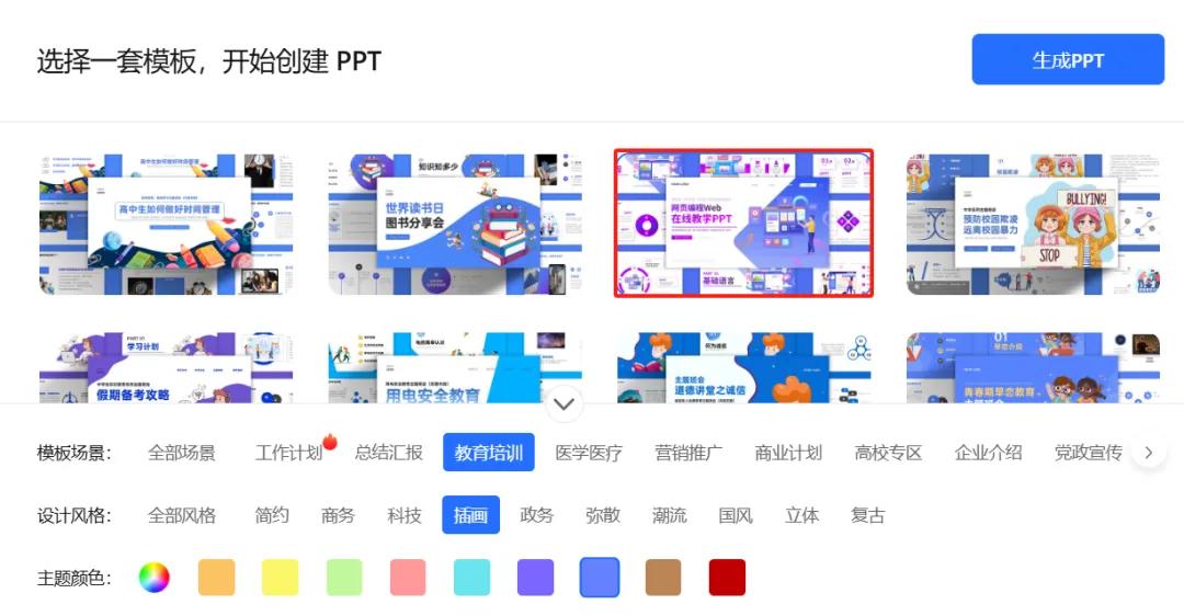Kimi 会根据大纲内容,结合其丰富的模板资源,快速生成 PPT 初稿。此时,我们可以从 Kimi 提供的众多模板中,选择一个最契合 PPT 主题的模板。以本次数据可视化课件为例,我们选择模板场景为教育培训,设计风格为插画,点击生成 PPT。瞬间,一份精美的 PPT 便呈现在眼前。