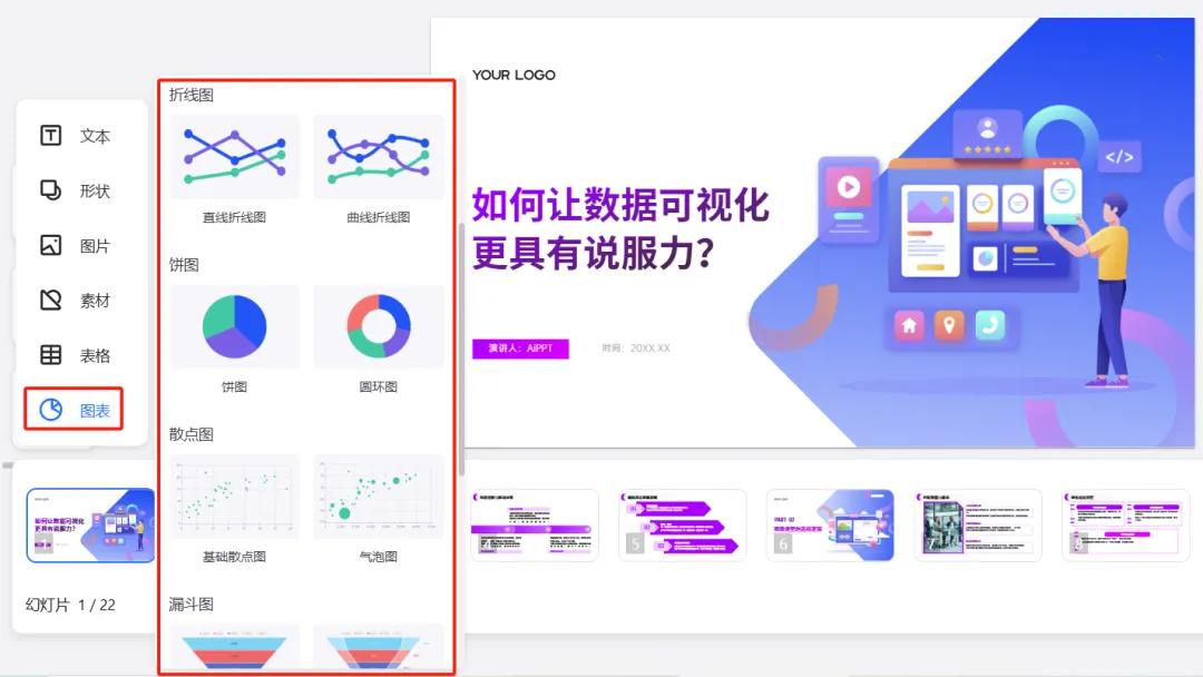 若 PPT 内容涉及图表相关,Kimi 支持多种图表类型的修改,如折线图、饼图、散点图、漏斗图等,我们可以根据数据特点和展示需求,选择最合适的图表类型,增强数据可视化效果;此外,还可以添加一些相关的图表和图片,进一步丰富 PPT 的内容。